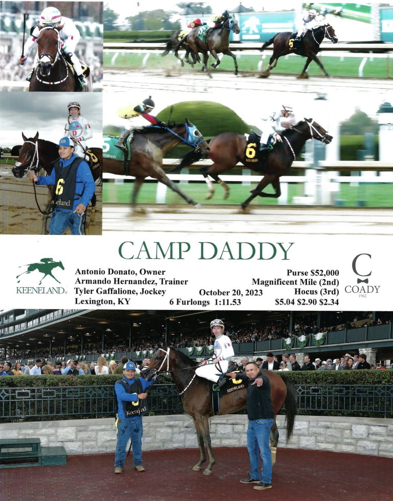 • Keeneland, Lexington KY; October 20, 2023, 2nd: Magnificent Mile; 3rd Hocus; Purse: $52,000; 6 Furlongs 1:11.53
