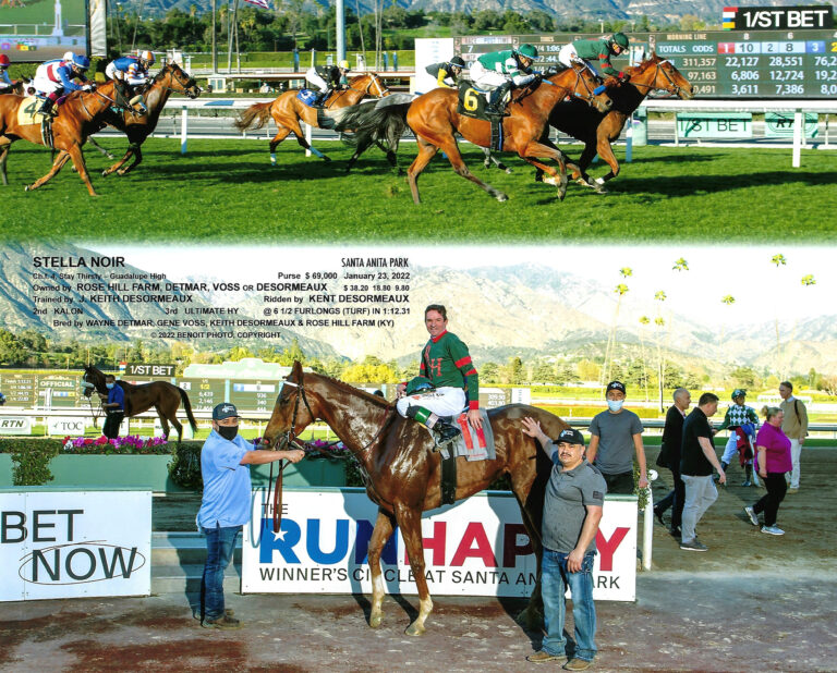 • Santa Anita Park; Purse: $69,000; 2nd: Kalon; 3rd Ultimate Hy; January 23, 2022; $38.20 – $18.80 – $9.80; 6 1/2 Furlongs (Turf) in 1:12.31